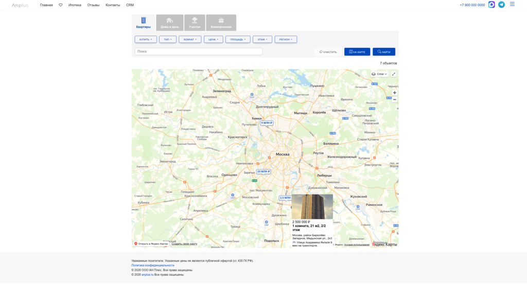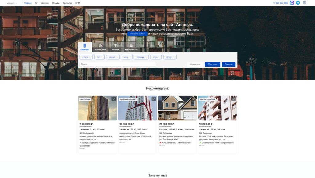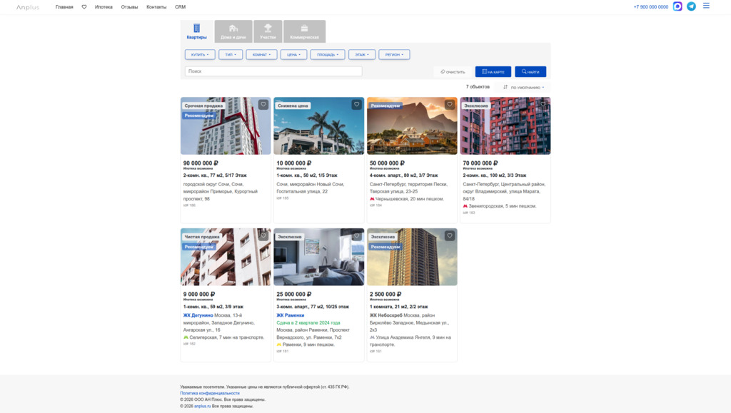 Каталог недвижимости с фильтрами: удобный поиск по типу объекта, цене, району, площади, статусу и другим параметрам.