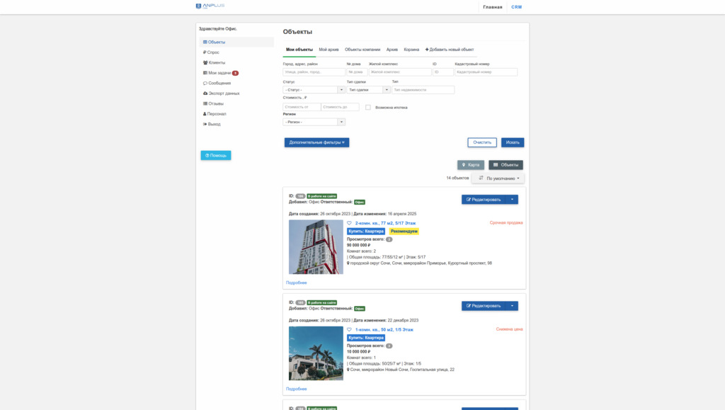 Личный кабинет риелтора: управление объектами, заявками, клиентами, задачами.
